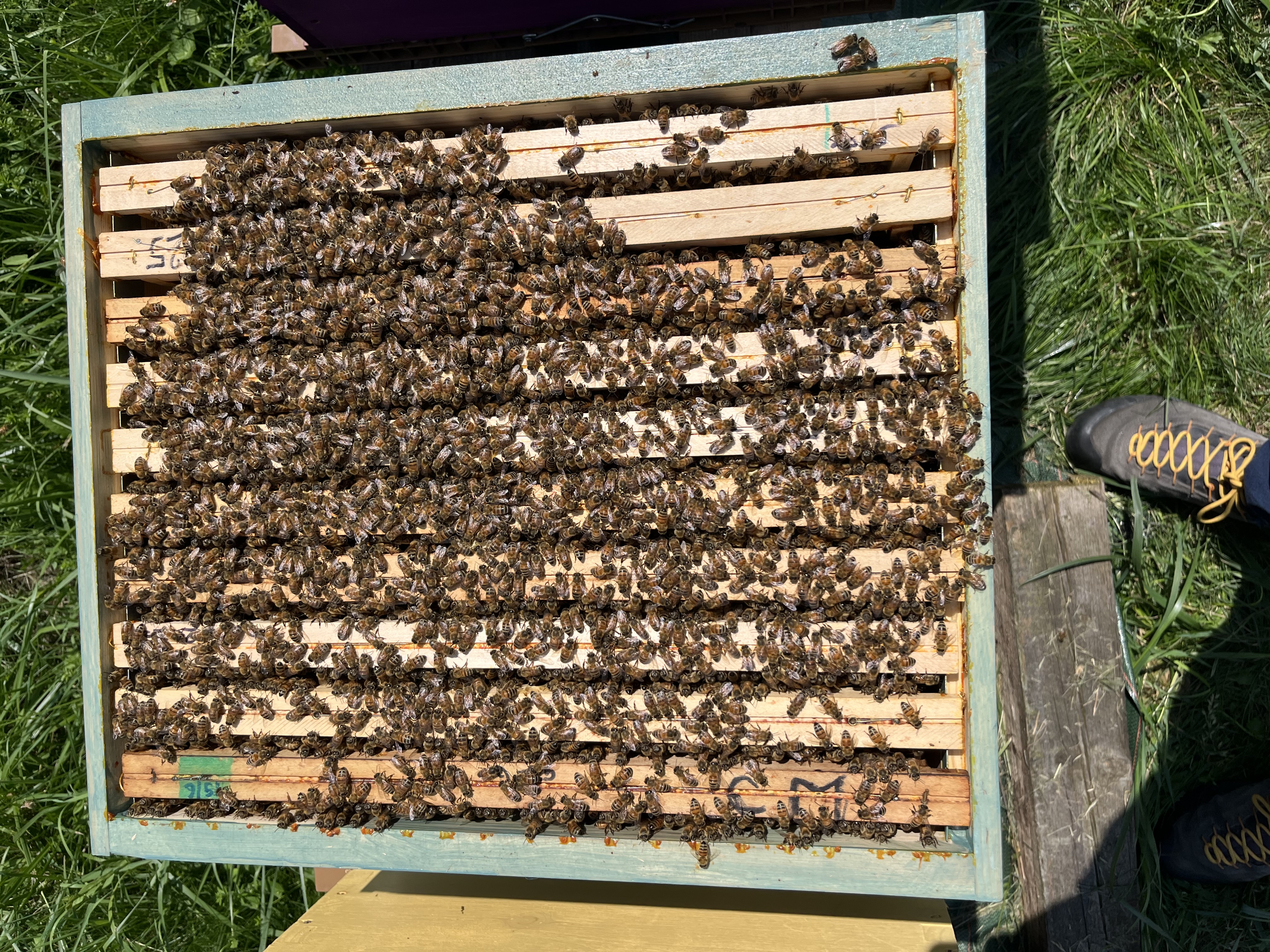 Depuis le printemps, les colonies ont connu une croissance impressionnante. En mars, certaines ruches ne comptaient qu’un cadre et demi d’abeilles. Aujourd’hui, elles débordent littéralement d’activité, comme le montre la photo ci-dessous : les cadres sont recouverts d’abeilles, signe d’une colonie en excellente santé. Cette évolution s’explique par le travail infatigable des abeilles et par la richesse florale de notre région de Satigny – Choully, au cœur du Mandement genevois. Du pissenlit printanier jusqu’au lierre d’automne, les butineuses ont trouvé nectar et pollen en abondance pour nourrir leurs larves et constituer des réserves de miel.